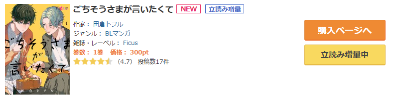 | 30代 | 女性 | 5 | しみじみと料理好きなところが伝わってきて、BLですがかなり共感できる漫画でした。 |