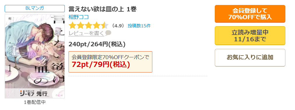 『言えない欲は皿の上』は2025年9月現在1巻のみ発売されているため、70%オフクーポンの適用で通常価格より185円お得に読むことができますが、購入上限金額には達していないため、他にも気になる作品があれば70%オフでお得に読むことができちゃいますよ♪