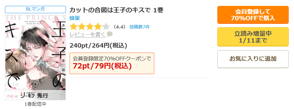 登録するだけで『カットの合図は王子のキスで』は264円/1巻→79円で読むことができちゃうんです。