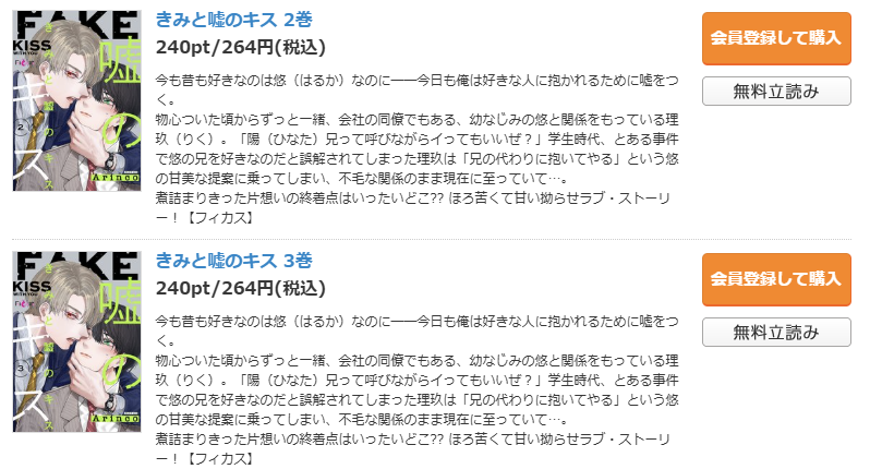 また、『きみと嘘のキス』の全巻(3巻)の全ページを無料で配信しているサイトは見つかりませんでした。