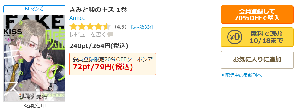 登録するだけでもらえるお得なクーポン、『きみと嘘のキス』の場合1冊264円→79円で読むことができます。