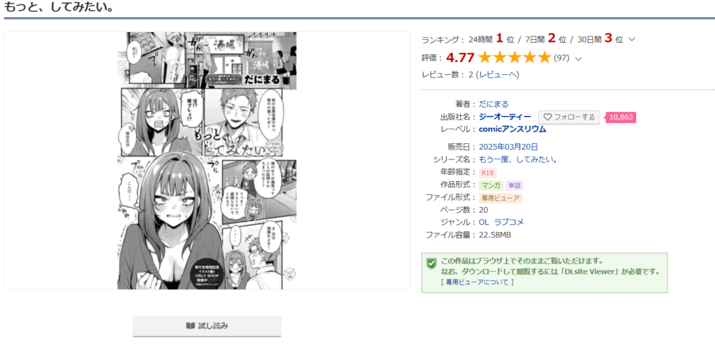 DLsiteの大きな特徴のひとつが、アダルトシーンを含めた試し読みが合法かつ無料で可能である点です。