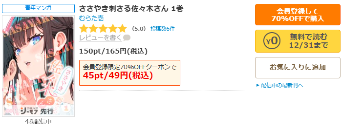 他サイトでの配信予定はないため、お得に『ささやき刺さる佐々木さん』を読みたい方はコミックシーモアがおすすめです!