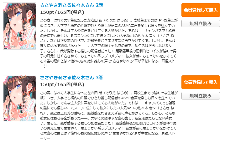2025年9月現在、『ささやき刺さる佐々木さん』はコミックシーモアで独占先行配信が行われていることがわかりました。
