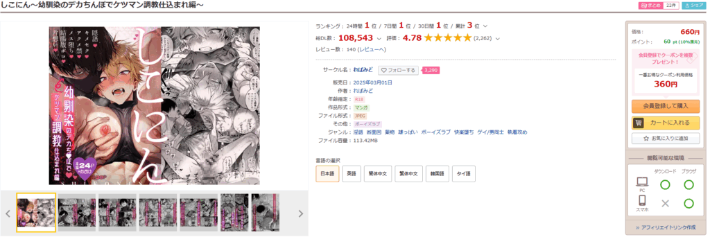 そのため、通常価格660円の『しこにん〜幼馴染のデカちんぽでケツマン調教仕込まれ編〜』も、クーポンを利用すれば 実質360円 で購入可能です。