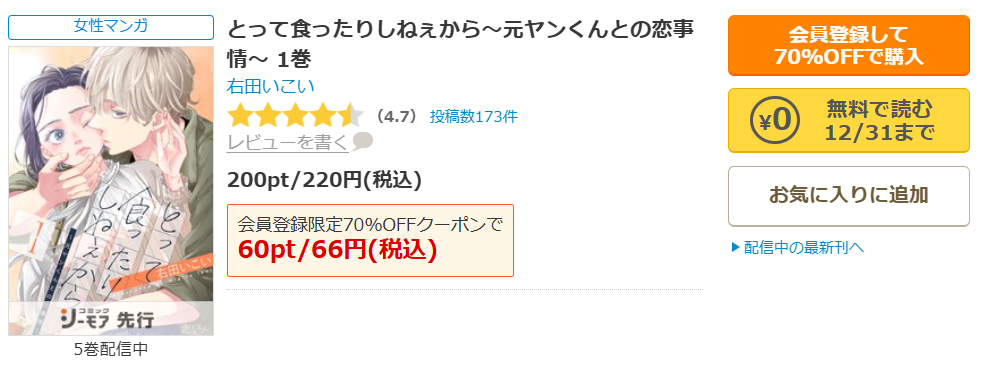 『とって食ったりしねぇから~元ヤンくんとの恋事情~』は、第1話が2025年12月31日まで無料配信中です。通常は220円かかるところ、今なら0円で読めるチャンス!これはかなりお得です。